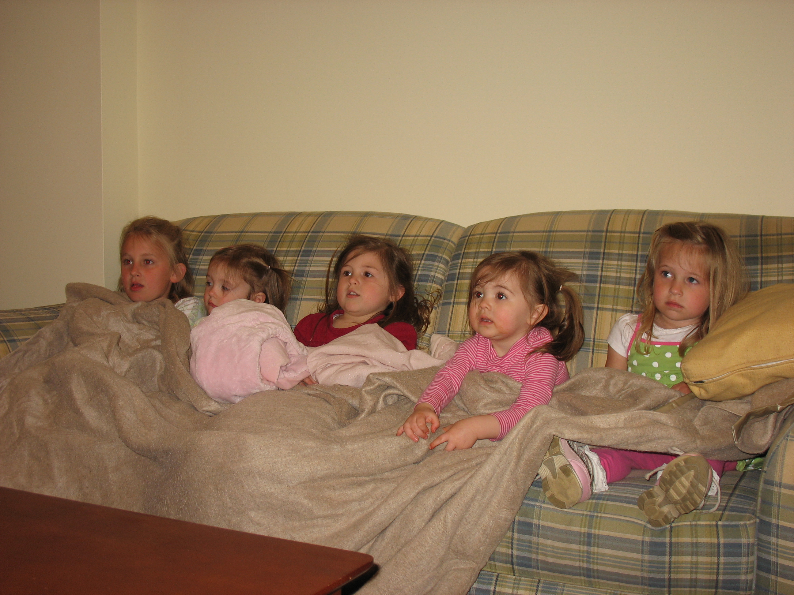 They can only go for so long before they need some quiet time. Here some of the girl cuzzies snuggle in to watch the Backyardigans while their parents dine on delicious sushi and have quiet adult conversation.:)