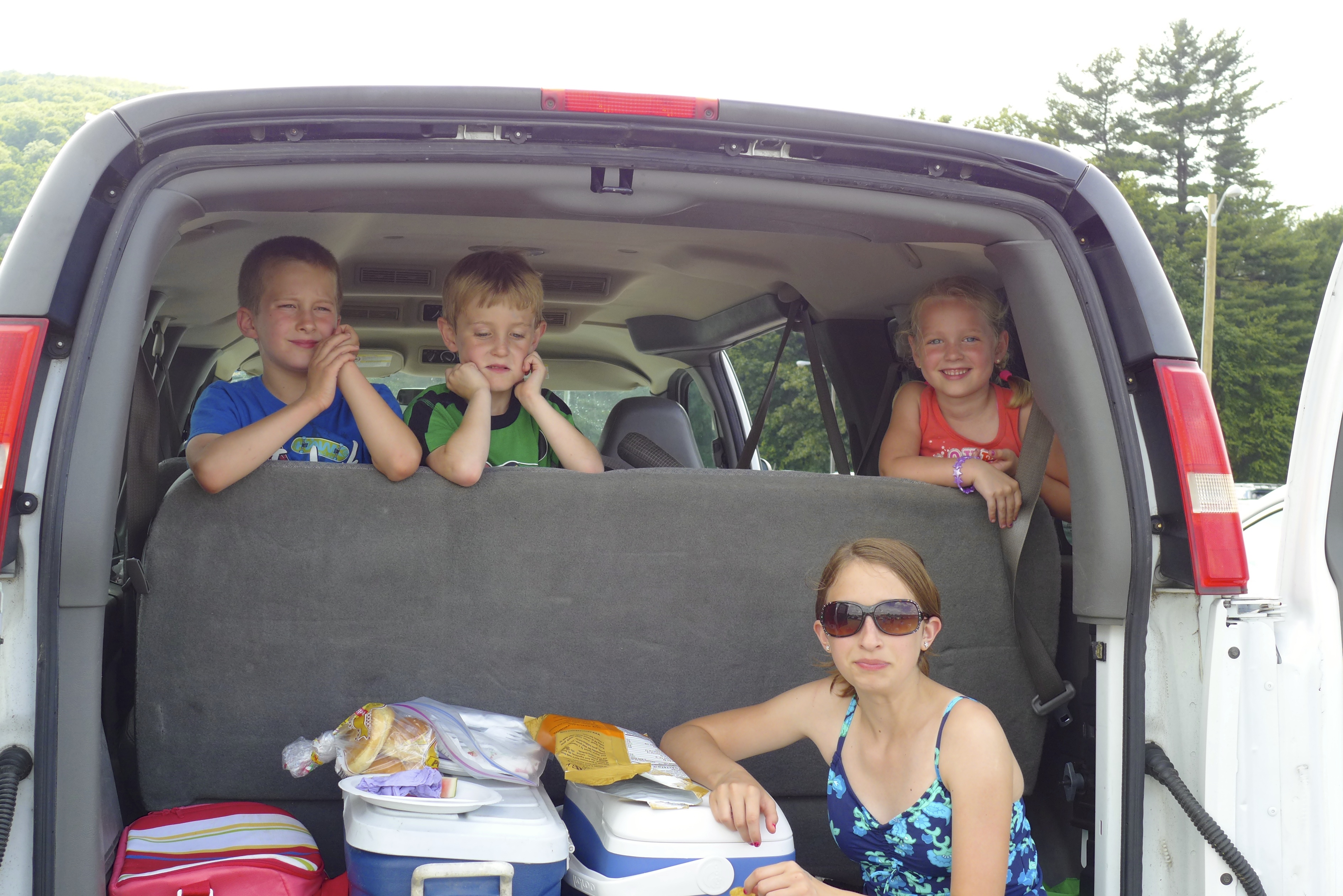 My mom trying on her new swimsuit in the 12-passenger van…humorous.
