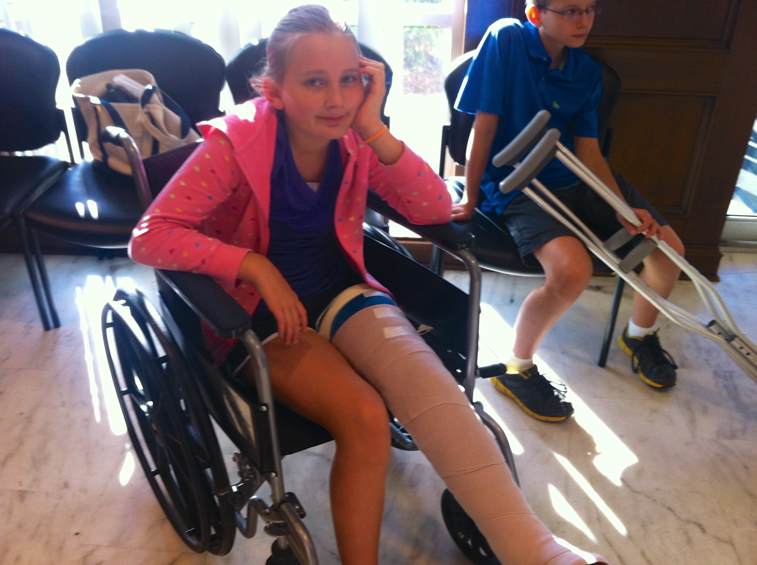 A fractured lower leg with a full-length cast and crutches.