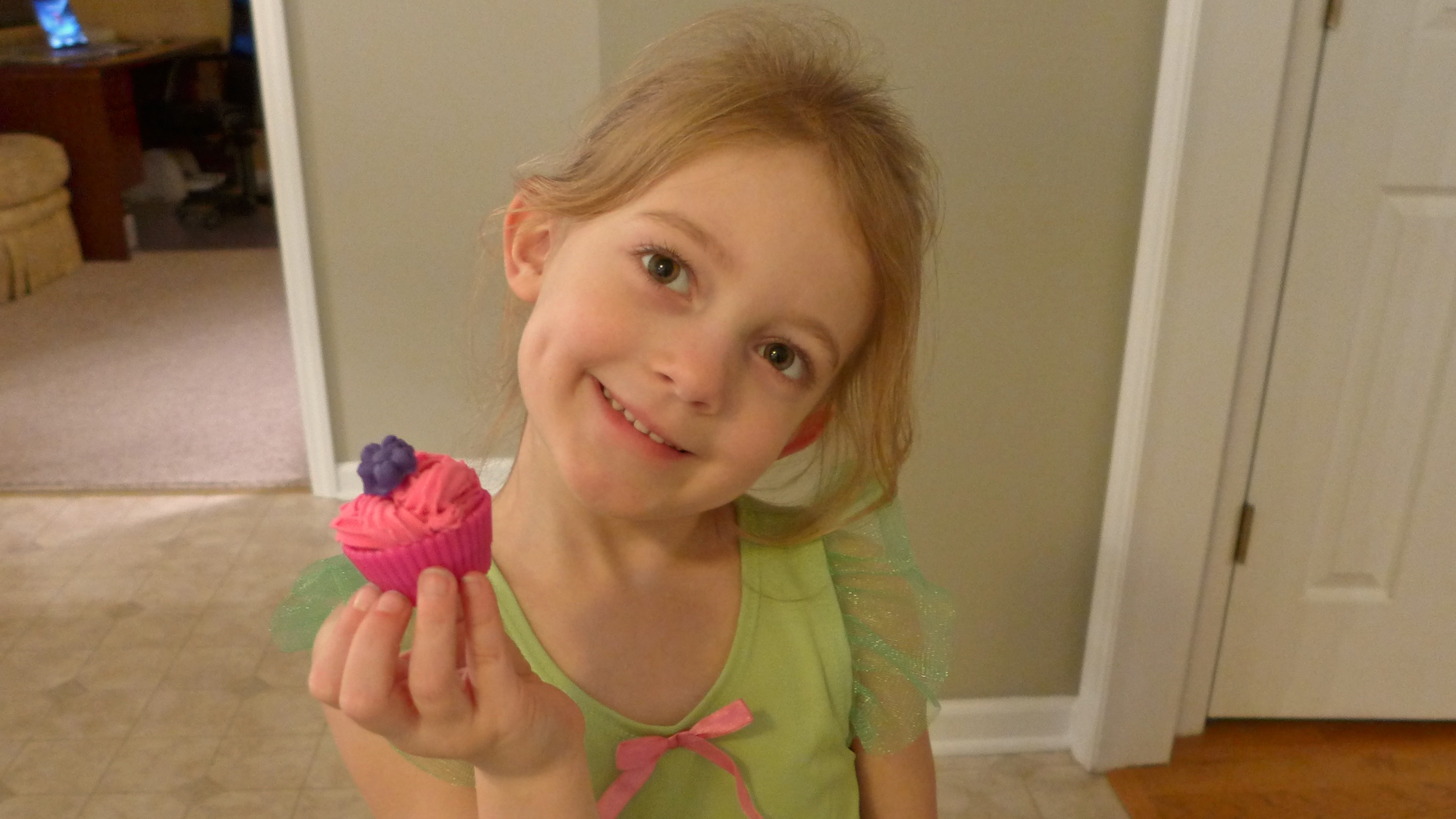 She ran upstairs to be transformed into her favorite little green fairy.