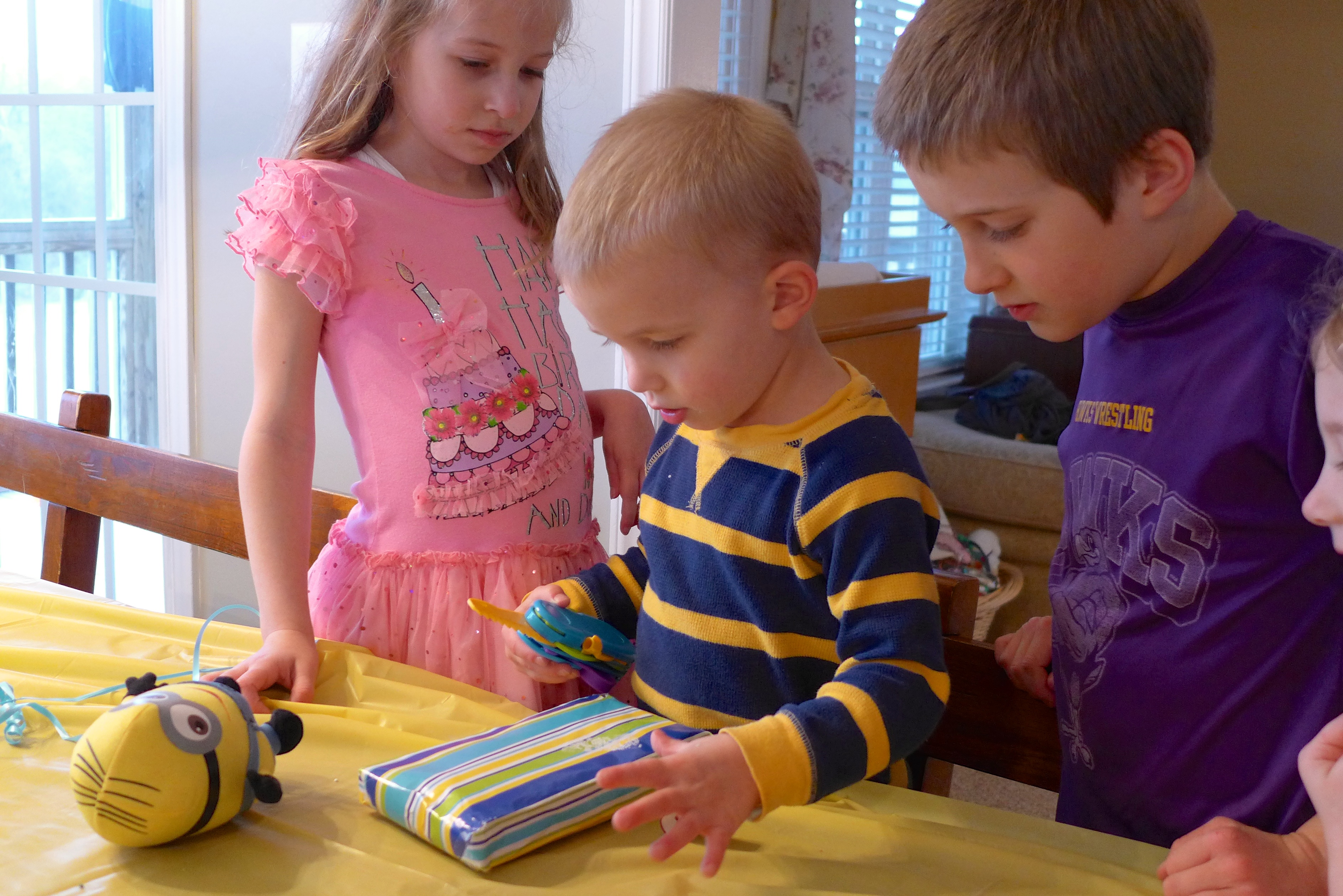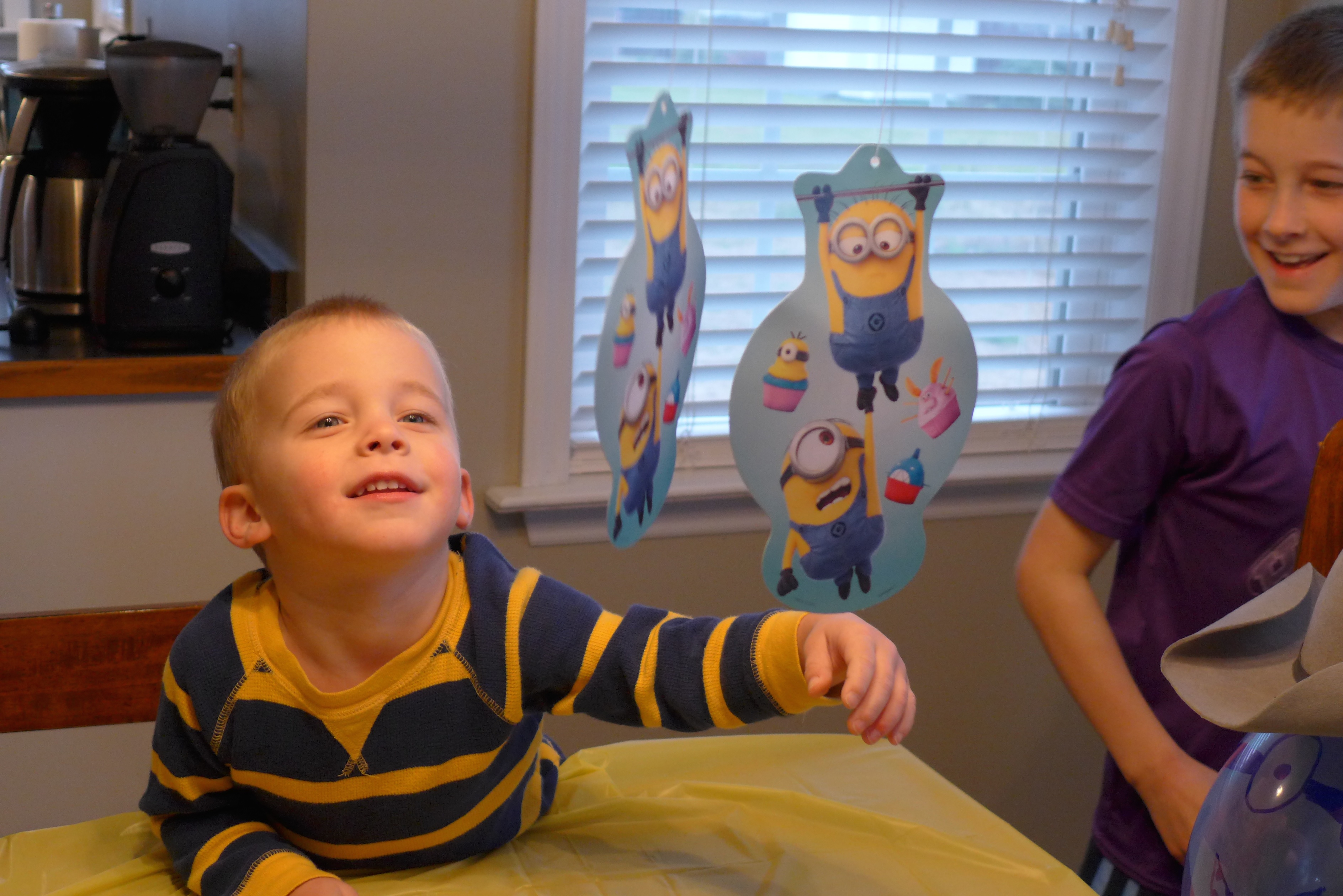 My oldest four kids are at such a great age and they helped me out tremendously in putting everything together. We scooted Logan off to bed early the night before and they began inflating balloons, wrapping presents, and decking the downstairs out in all things minion, so that their little brother would have quite a surprise waiting for him come morning.