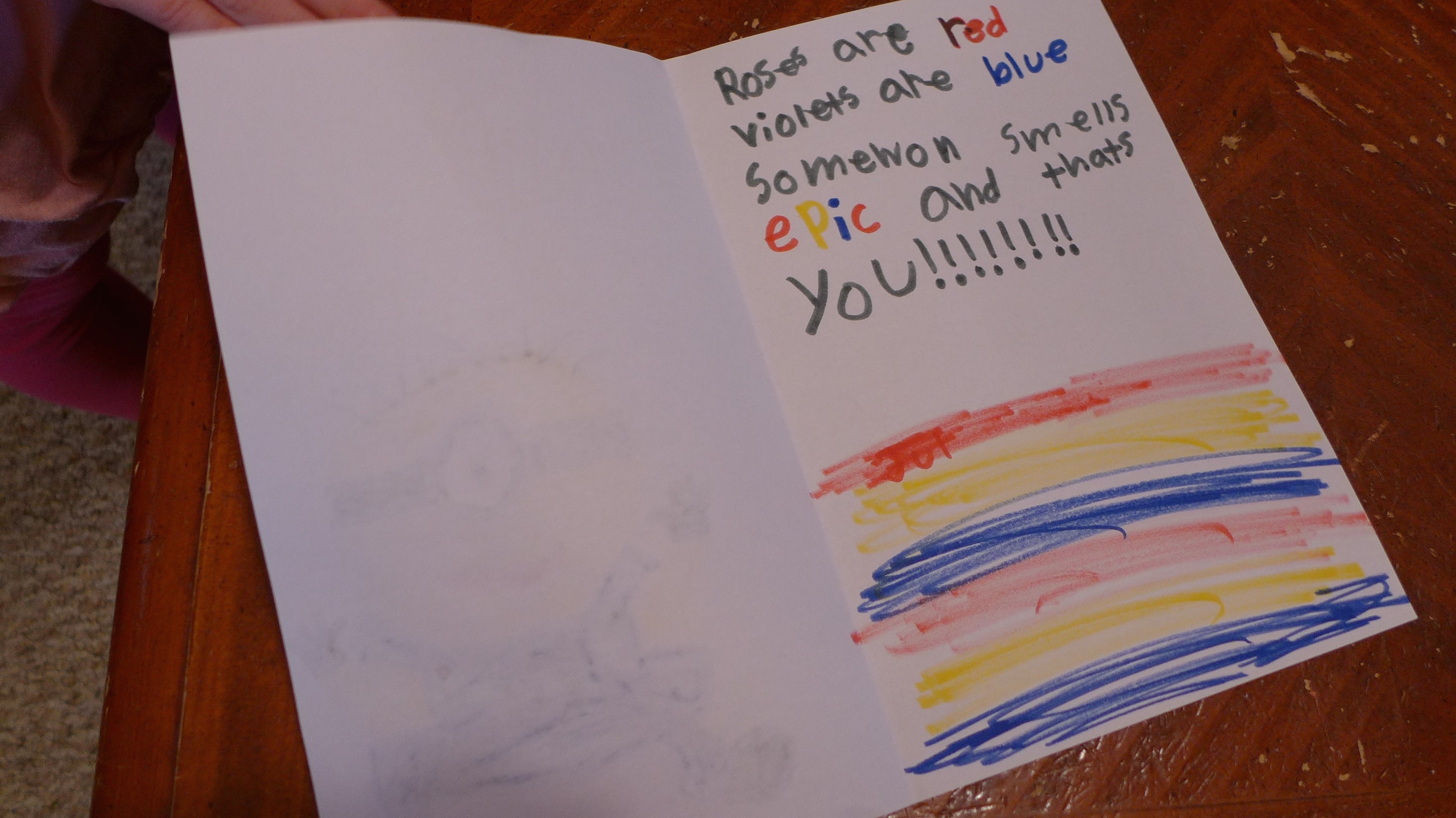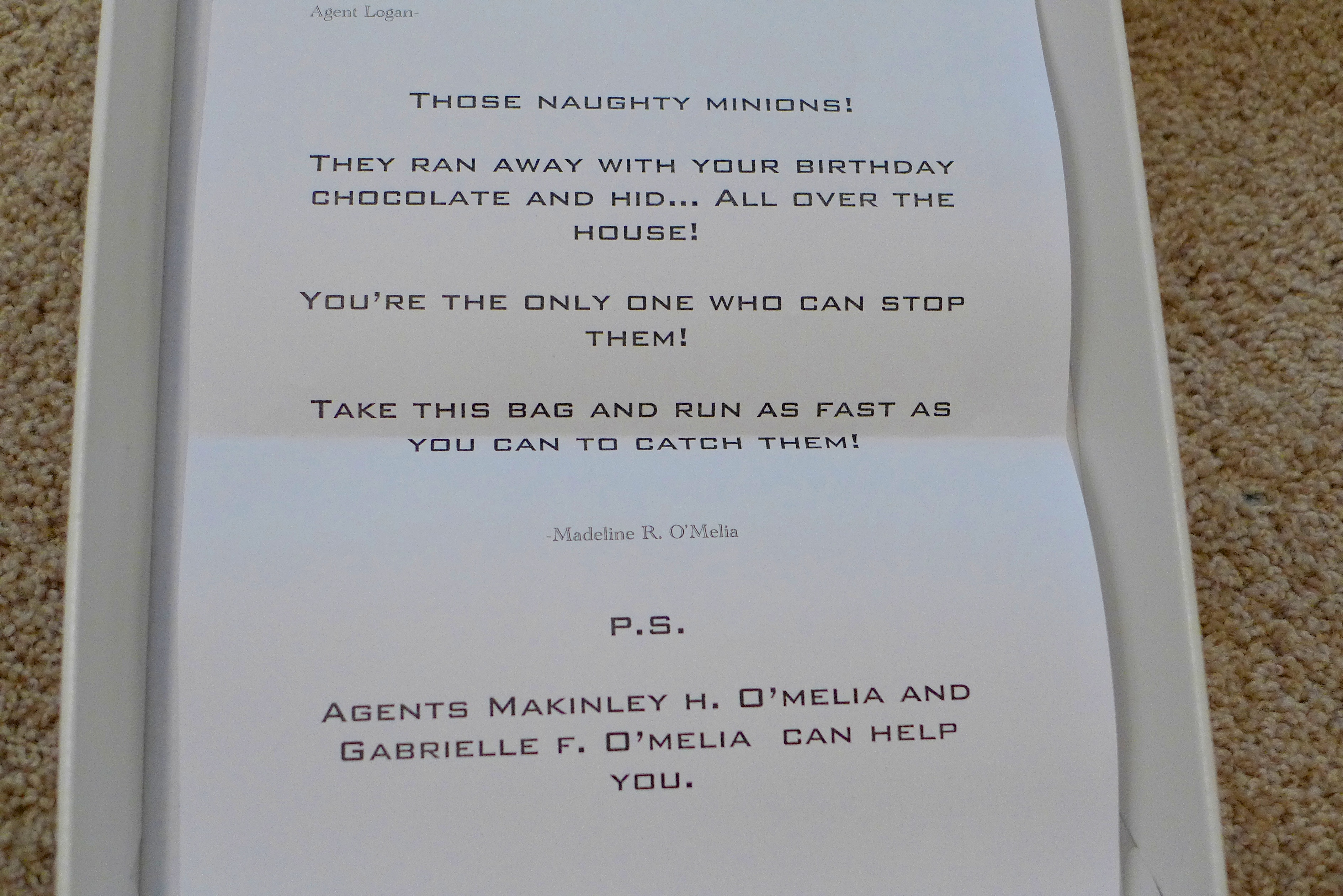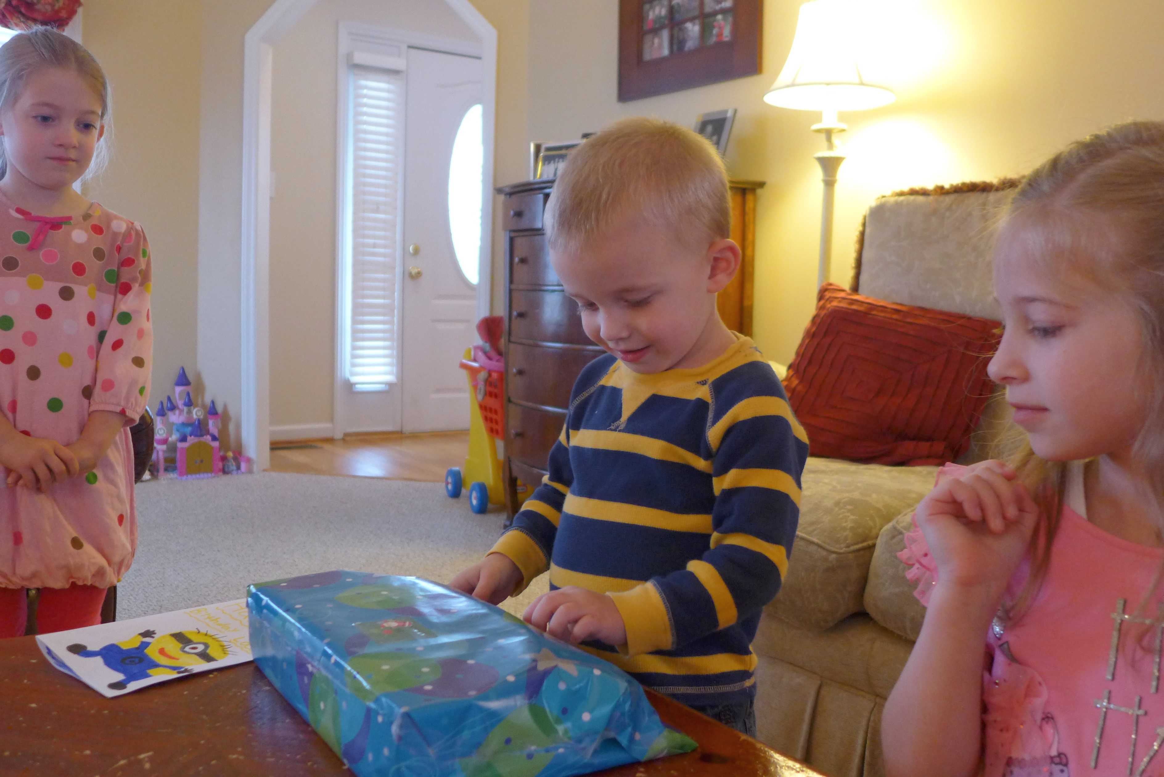 The kids arranged all the gifts and hid minions among them. Lukie added his special homemade card to the display. It was one-of-a-kind special.