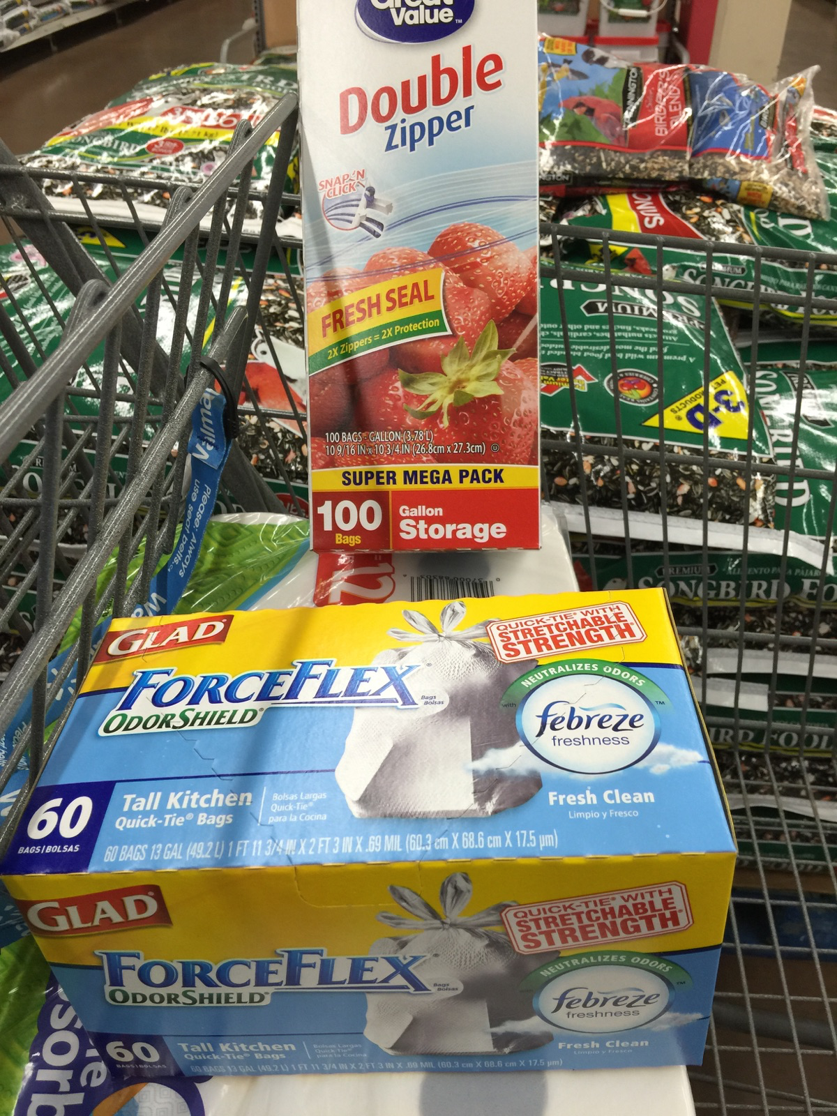 Gallon Ziplocs, wipes, paper towels, and scented trash bags are acquired.