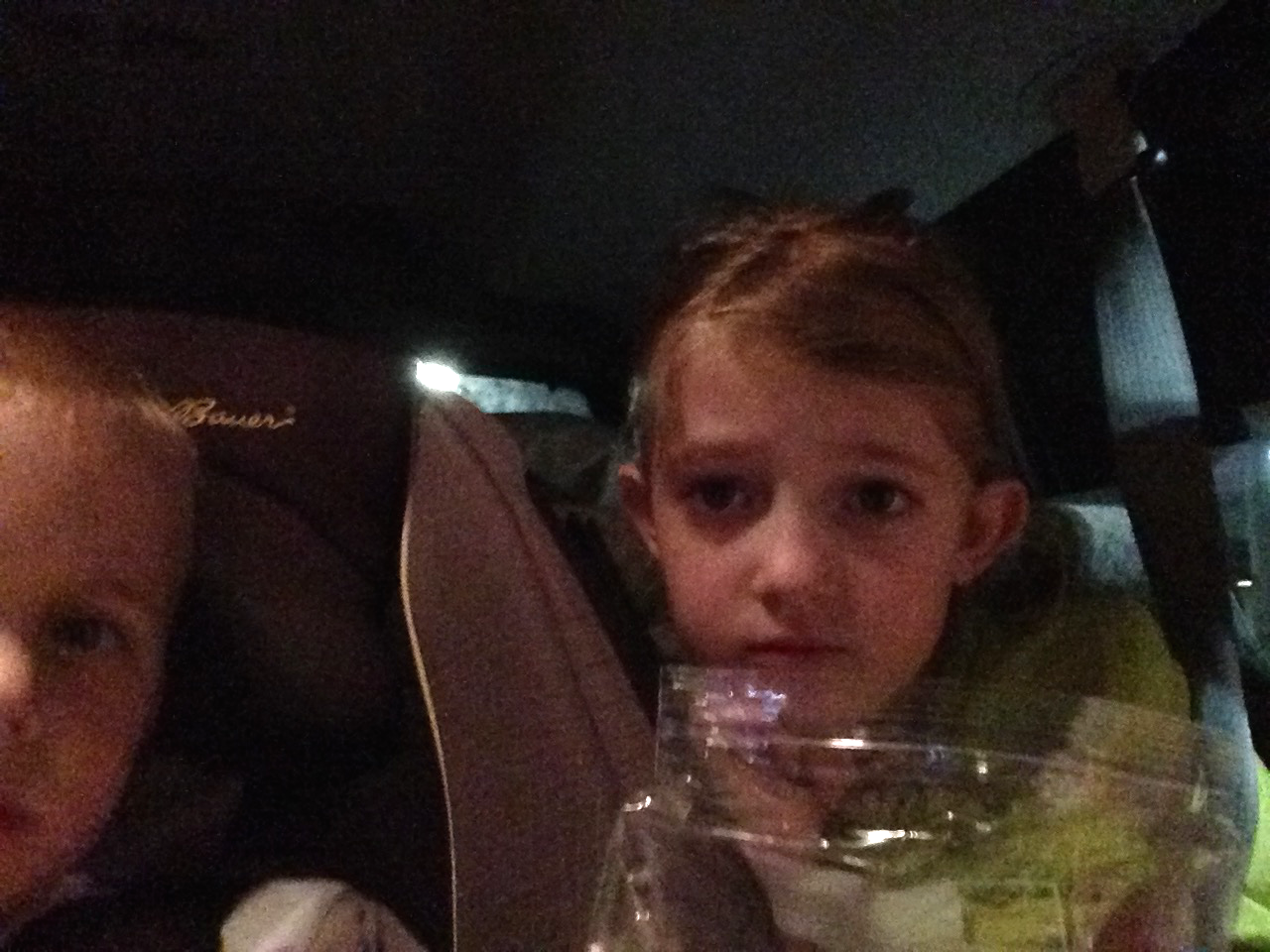 The van is quiet, children content.